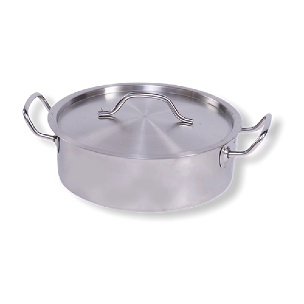 A steel pot distinguished by its large capacity, durability, and quality workmanship. It contains two handles for ease of use and also includes a lid with a handle.